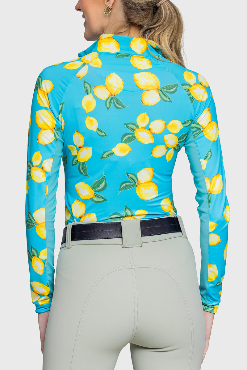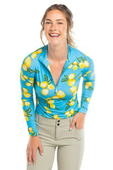 The island of Capri is calling! Our signature lemon print features an azure blue ground, highlighting the lovely painterly quality of the lemons. Long sleeves, ¼ zip, UPF 30, breathable power mesh and soft 4-way stretch fabric in a contemporary fit. Cin Cin!
