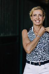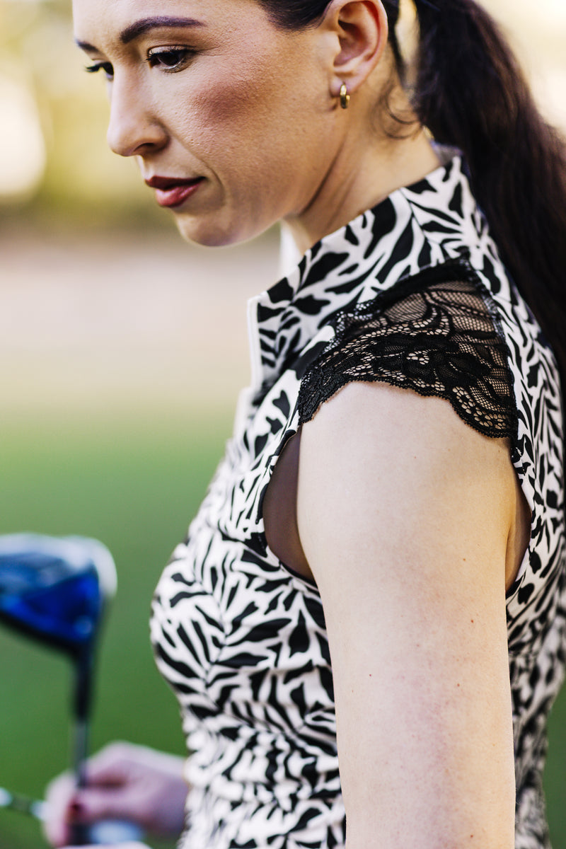 This season our elevated, ¼ zip tank features our signature black and white climbing vine print and soft, stretchy, feminine lace insets at the shoulders. UPF 30, (apply sunscreen under the lace) ¼ zip, soft 4-way stretch fabric in a contemporary fit