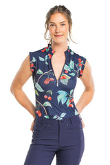 The perfect pick-me-up this season! Our cherries ruffle tank in rich navy with sporty zipper will turn heads. UPF 30, 9” zip and soft 4-way stretch fabric in a contemporary fit.